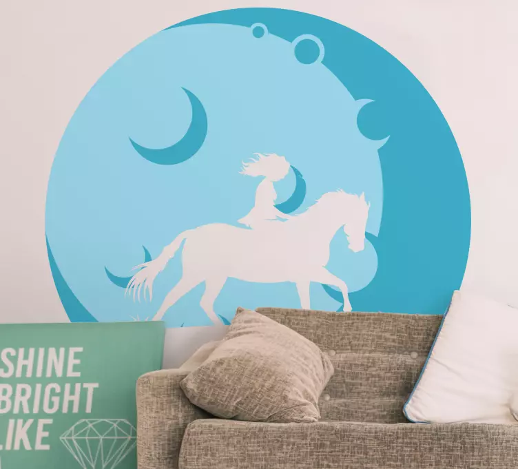참조:: A48385평화로운 푸른 달 배경 속에서 말을 타고 있는 소녀를 그린 매력적인 장면. 실루엣이 꿈 같은 분위기를 만들어내며 자유와 모험의 감정을 불러일으킵니다. 이 디자인은 자연 속에서의 기발한 여행의 본질을 포착하여 어떤 아이 방에도 잘 어울립니다.