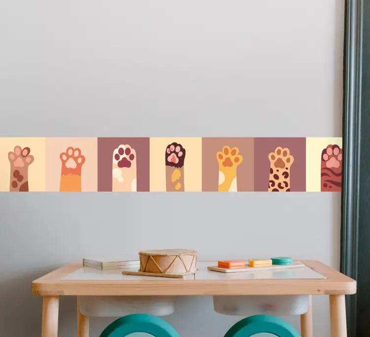 다양한 발자국의 생동감 넘치는 배열, 서로 다른 패턴과 색조를 보여줍니다. 이 장난기 가득한 디자인은 장난스러운 반려동물의 본질을 포착하며, 공간에 기발한 터치를 추가하고 싶은 동물 애호가들에게 완벽합니다.