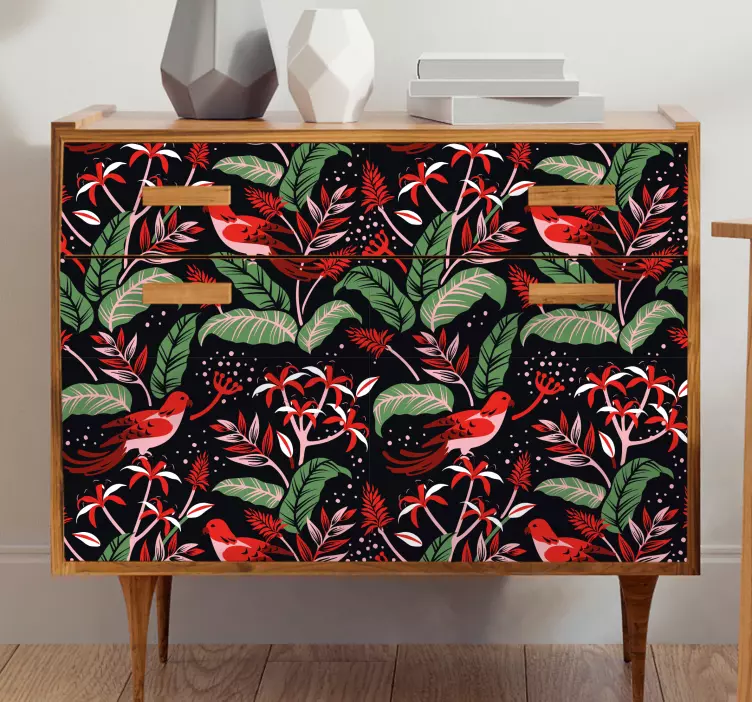 참조:: A53481어두운 배경 위에 붉은 새와 무성한 녹색 잎사귀가 어우러진 생동감 넘치는 열대 꽃 패턴. 이 디자인은 다양한 꽃 요소와 생기 있는 색상을 결합하여 에너지가 넘치고 신선한 분위기를 만들어내며, 어떤 환경에도 자연의 터치를 더하기에 완벽합니다.