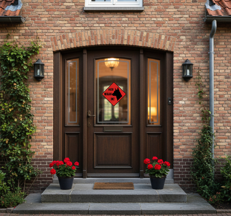 아늑한 입구는 따뜻한 벽돌 벽으로 둘러싸인 우아한 나무 문으로 구성되어 있습니다. 장식용 랜턴이 분위기를 한층 더 고조시키고, 화분에 담긴 생동감 넘치는 꽃들이 자연의 느낌을 더합니다. 개의 실루엣을 특징으로 하는 인상적인 간판은 경계심을 주어 손님들이 주변을 인식할 수 있도록 합니다. 창 스티커 나는 여기서 지켜보고 있어요