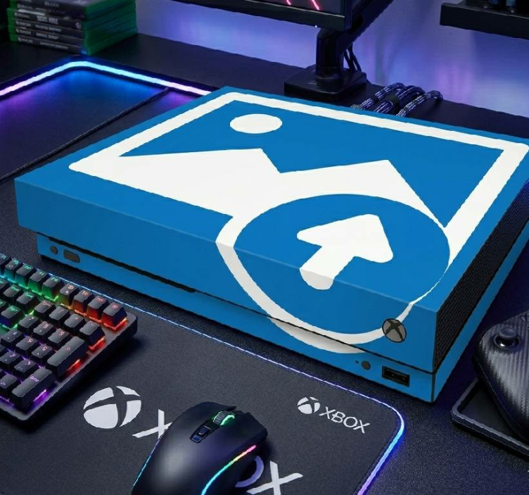 선명한 파란색 디자인은 창의성과 장난기를 상징하는 두드러진 흰색 이미지 아이콘을 특징으로 합니다. 콘솔 디자인은 위쪽으로 향하는 움직임을 제안하는 독특한 화살표 요소를 포함하여 시각적 매력을 높입니다. 주변 요소로는 다채로운 키가 있는 게임 키보드가 있어 전체적인 미적 감각에 생동감을 더합니다.