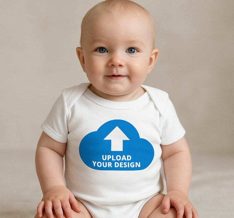 밝은 표정의 아기가 카메라를 향해 미소를 지으며, 화이트 색상의 바디수트에 생동감 넘치는 파란 구름 그래픽이 장식되어 있습니다. 디자인에는 위쪽을 가리키는 화살표와 함께 'UPLOAD YOUR DESIGN'라는 텍스트가 포함되어 있습니다. 이 장난기 가득한 의상은 맞춤형 의류를 선보이기에 완벽하며, 사랑스럽고 매력적인 접근 방식으로 주목을 끌고 있습니다.