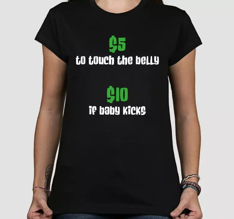참조:: T5441이 유쾌한 디자인은 임신 상호작용에 대한 유머러스한 접근을 보여주며, 검은 배경에 굵은 녹색 텍스트를 특징으로 합니다. 이는 아기 배를 만지는 것에 대한 경쾌한 제안을 제공하며, 재미있는 가격을 함께 제시하여 예비 부모나 아기 샤워에 적합합니다.