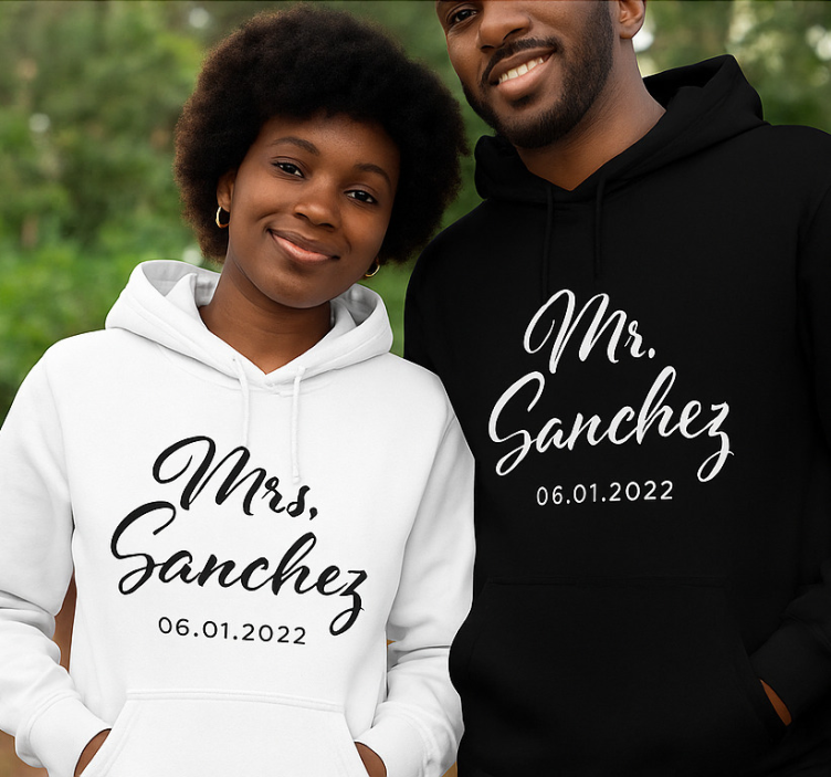 이 이미지는 커플이 자랑스럽게 매칭 후드를 입고 있는 모습을 담고 있습니다. 여성은 "Mrs. Sanchez"라는 글자가 두드러지게 인쇄된 흰색 후드를 입고 있으며, 남성은 "Mr. Sanchez"라고 적힌 검은색 변형 후드를 착용하고 있습니다. 결혼 날짜가 포함된 이 스타일리시한 의상은 통일성과 매력을 상징하며, 기억에 남는 특별한 날에 딱 어울립니다. 티셔츠 두 커플 '산체스'는 사랑을 표현하는 독특한 디자인으로, 커플들이 함께 입기 좋은 스타일을 제공합니다. 이 티셔츠의 그래픽 디자인은 서로의 연결성을 상징하며, 다양한 상황에서 함께 즐길 수 있는 완벽한 선택입니다. 우리의 티셔츠 두 커플 '산체스'로 특별한 순간을 만들어보세요!