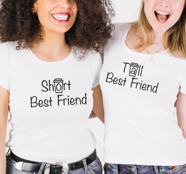 참조:: T4553이 이미지는 키를 유머러스하게 나타내는 맞춤형 셔츠를 입은 두 친구를 보여줍니다. 한 셔츠에는 'Short Best Friend'라고 적혀 있고, 다른 셔츠에는 'Tall Best Friend'라고 적혀 있습니다. 이 장난스러운 텍스트는 그들의 우정과 유대를 강조합니다.