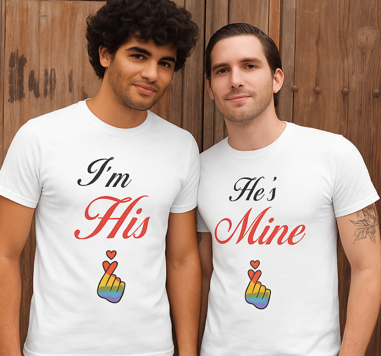 이 이미지는 두 남성이 자랑스럽게 일치하는 티셔츠를 입고 있는 모습을 담고 있습니다. 각 티셔츠에는 독특한 문구가 적혀 있습니다: 하나는 'I'm His'라고 적혀 있고, 다른 하나는 'He's Mine'이라고 적혀 있습니다. 다채로운 하트 모티프와 함께 이 디자인은 사랑과 연결을 축하하며, 생동감 넘치는 LGBTQ+ 프라이드 색상으로 관계를 상징합니다. 티셔츠 두 lgbt 나는 그의 것입니다