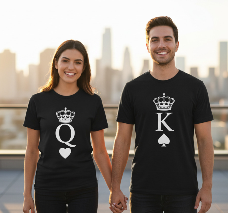 활기찬 도시 환경에서, 한 커플이 손을 잡고 서 있으며 맞춤형 티셔츠를 선보이고 있습니다. 여성은 하트가 있는 왕관을 쓴 'Q'가 그려진 티셔츠를 입고 있고, 남성은 스페이드와 함께 왕관을 쓴 'K'가 있는 티셔츠를 착용하고 있습니다. 두 사람의 의상은 스타일과 유대감을 발산합니다.