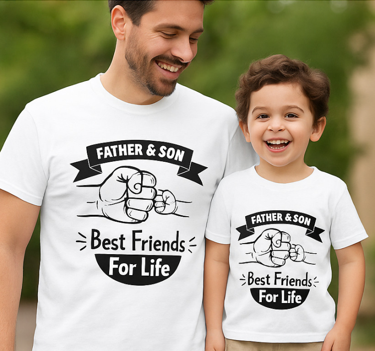 즐거운 아버지와 아들의 듀오가 매칭된 흰색 티셔츠를 입고 미소를 짓고 있습니다. 장난기 가득한 디자인은 그들의 강한 유대를 상징하는 주먹 인사를 특징으로 합니다. 굵은 글씨로 'Father & Son'과 함께 'Best Friends For Life'라는 문구가 적혀 있어 그들의 애정 어린 관계를 강조합니다. 야외 배경은 따뜻하고 초대하는 분위기를 더합니다. 티셔츠 리치 아버지의 주먹 인사