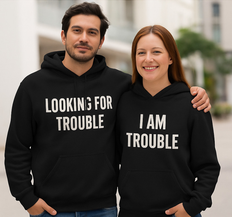 이미지에서 한 커플이 장난스러운 문구가 적힌 검은 후드티를 맞춰 입고 자신감 있게 포즈를 취하고 있습니다. 남성의 스웨트셔츠에는 'LOOKING FOR TROUBLE'이라고 적혀 있고, 여성의 스웨트셔츠에는 'I AM TROUBLE'이라고 적혀 있습니다. 그들의 미소와 편안한 태도는 경쾌한 분위기를 보여주며, 흐릿한 도시 배경이 그들의 스타일리시한 모습을 강조하고 있습니다. 티셔츠 두 문제를 찾고 있어요