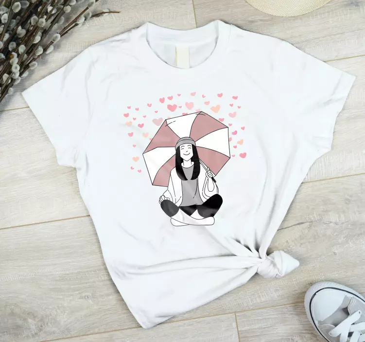 티셔츠 매력적인 하트 패턴이 티셔츠 매력적인 하트 패턴은 귀여운 만화 스타일로 디자인되어 있으며, 우산을 들고 있는 사랑스러운 여자가 웃고 있는 모습이 인상적입니다. 비가 오는 날에도 사랑의 감정을 표현할 수 있는 이 티셔츠는 평상복으로 활용하기에 완벽하며, 편안한 착용감을 제공합니다. 이 티셔츠를 입고 외출하면 누구나 행복한 기분을 느낄 수 있습니다!