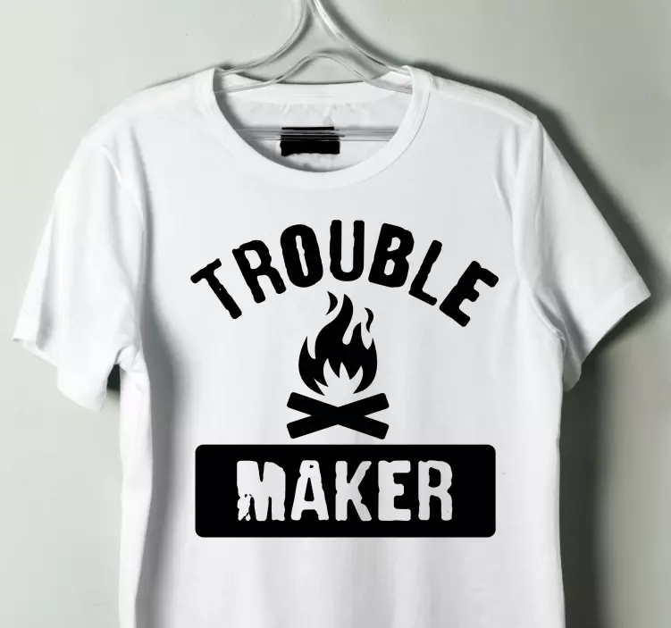 이 눈길을 끄는 디자인은 'Trouble Maker'라는 굵은 텍스트와 함께 불꽃과 캠프파이어 심볼이 특징입니다. 재미있고 모험적인 정신을 가진 사람들에게 완벽합니다. 검은색과 흰색의 대비는 흥미로운 요소를 더하고 자연스럽게 주목을 끌어냅니다.