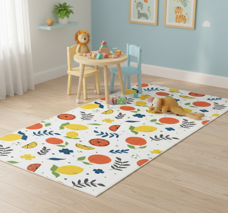 생동감 있는 패턴은 오렌지와 레몬을 포함한 다양한 감귤류 과일과 잎이 무성한 초록 요소, 섬세한 파란 꽃들로 구성되어 있습니다. 디자인에는 과일의 스타일화된 조각들이 포함되어 있으며, 노란색, 주황색, 초록색 같은 장난기 가득한 색상이 사용되어 있습니다. 이 모든 요소는 깨끗한 흰색 배경 위에 놓여 있어 생기 넘치는 구성을 더욱 강조합니다. 비닐 카펫 동물 감귤류 과일과 잎사귀