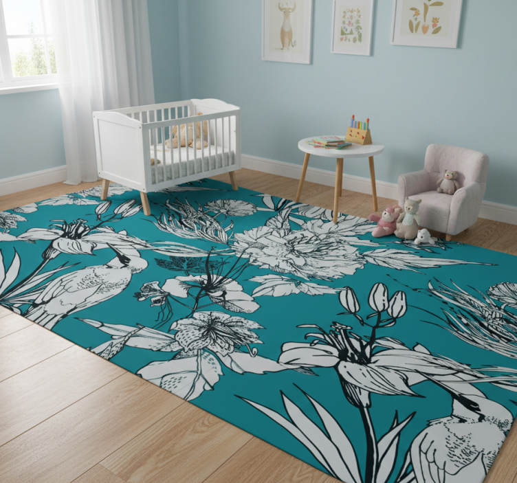 다채로운 디자인으로, 청록색 배경에 흑백으로 그려진 다양한 꽃 요소들이 포함되어 있습니다. 구성에는 여러 종류의 꽃, 잎사귀, 그리고 새가 포함되어 있어 역동적인 시각적 대비를 만들어냅니다. 꽃과 식물의 복잡한 세부 사항이 전체적인 미학에 깊이와 풍부함을 더해줍니다. 비닐 카펫 동물 화이트 야생 새 우아한 패턴
