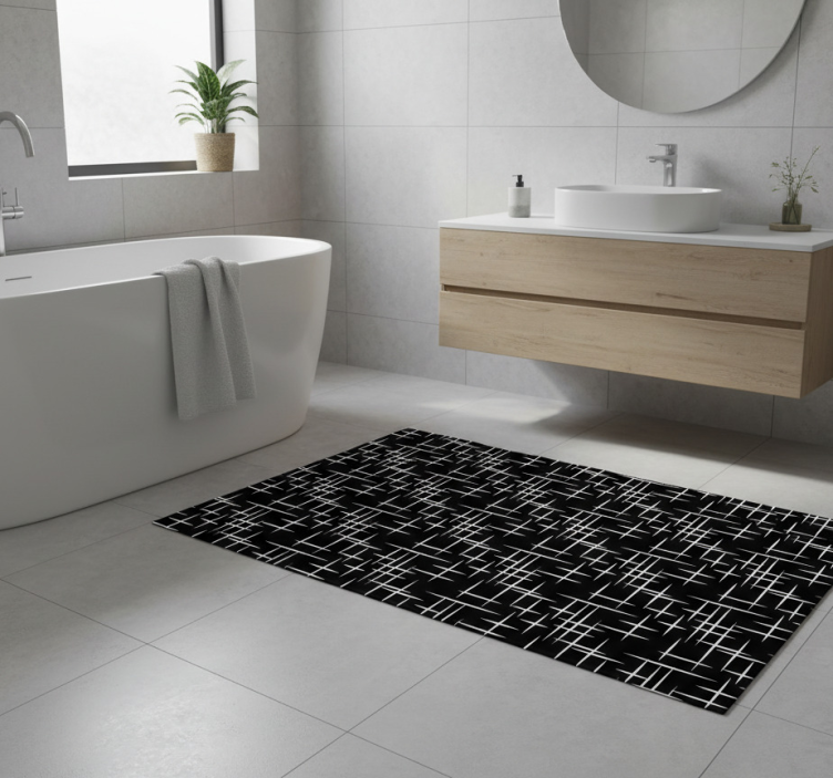 디자인은 검정과 흰색 선들이 striking하게 상호작용하여 추상적인 패턴을 만들어냅니다. 선들은 두께와 방향이 다양하여 시각적으로 흥미로운 동적인 그리드 구조를 형성합니다. 이 현대적인 모티프는 현대 미학에 적합하며, 그래픽적인 매력으로 공간을 향상시킵니다. 욕실용 비닐 카펫 현대적 선 디자인