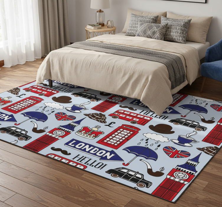 디자인은 런던과 관련된 상징적인 요소들이 생동감 있게 배열되어 있습니다. 여기에는 빨간 이층 버스, 검은 택시, 빅벤, 왕관, 그리고 여러 개의 우산이 포함됩니다. 색상 팔레트는 빨강, 파랑, 흰색으로 구성되어 있으며, 모자, 커피 컵, 그리고 수염의 장난기 있는 일러스트로 보완되어 있습니다. 모든 요소는 연한 파란색 배경 위에 배치되어 있습니다. 침실용 비닐 카펫 영국 런던의 베스트입니다