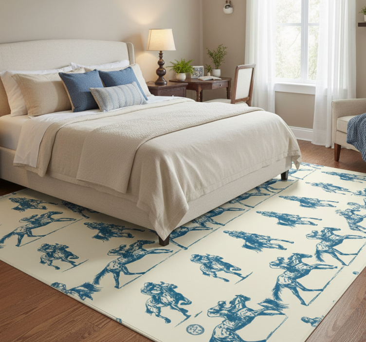 이미지에는 반복되는 기마 장면이 특징으로, 역동적인 자세로 달리는 말 위의 라이더들이 보여집니다. 디자인은 파란색과 크림색의 색상 팔레트를 사용하여 눈에 띄는 대비를 만듭니다. 예술적 스타일은 빈티지 일러스트레이션을 닮아 있으며, 작품 전반에 걸쳐 움직임과 에너지를 부여합니다. 침실용 비닐 카펫 푸른색과 베이지색 말 무늬