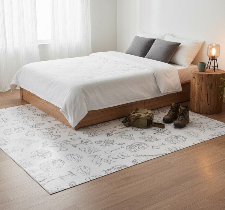 이미지는 다양한 세밀한 일러스트로 장식된 밝은 배경을 보여줍니다. 나무, 산, 나침반, 지도와 같은 요소들이 포함되어 있으며, 디자인은 배낭과 캠핑 모티프에 의해 보완됩니다. 그림은 주로 검은색으로 되어 있어 흰색 배경과 강렬한 대비를 이루며, 야외 모험 테마를 더욱 강조합니다. 침실용 비닐 카펫 손으로 그린 나침반과 산악 소품
