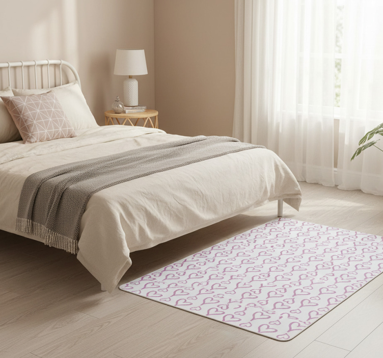 이미지는 부드러운 분홍색으로 표현된 반복적인 하트 패턴이 있는 러그를 보여줍니다. 각 하트는 부드럽고 흐르는 윤곽을 가지고 있어 리듬과 조화의 느낌을 줍니다. 디자인은 장난스럽고 초대하는 느낌을 주어 어떤 공간에도 매력적인 추가 요소가 됩니다. 침실용 비닐 카펫 분홍색 일러스트 하트 아이콘
