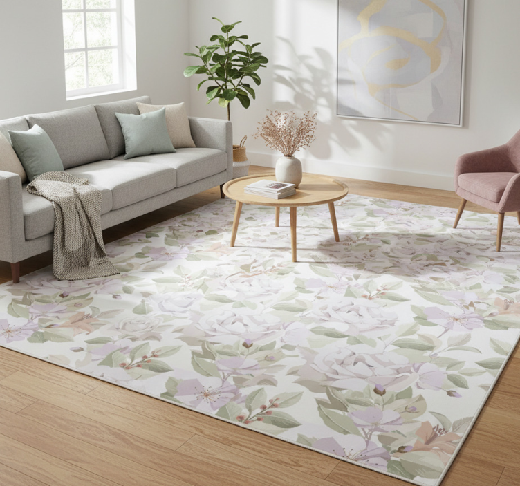 디자인은 부드러운 파스텔 색조로 구성된 섬세한 꽃과 잎의 배열을 특징으로 합니다. 큰 만개한 장미가 더 작은 꽃들과 얽혀 조화로운 식물 패턴을 만들어냅니다. 전체 색상 팔레트는 연한 분홍색, 녹색, 그리고 흰색의 힌트를 포함하며, 모두 꽃 요소를 강조하는 미세한 배경 위에 놓여 있습니다. 비닐 카펫 꽃과 식물 우아한 꽃무늬 패턴