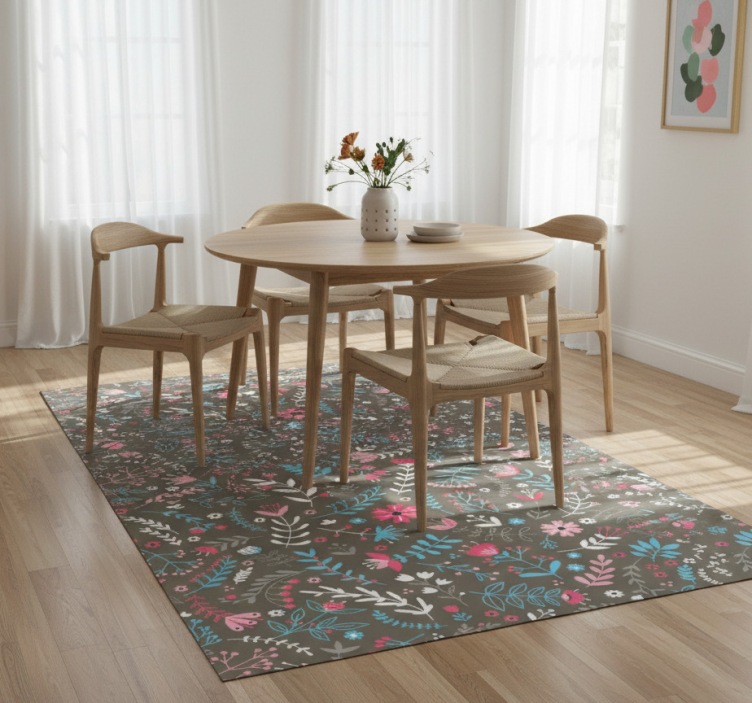생동감 넘치는 디자인은 부드러운 회색 배경 위에 다채로운 꽃과 잎 패턴이 배열되어 있습니다. 밝은 핑크색, 파란색, 그리고 섬세한 흰색이 복잡한 잎사귀와 얽혀 있어 생기 있고 장난기 가득한 비주얼을 만들어냅니다. 이 작품은 다양한 형태와 크기의 꽃을 보여주며, 유기적인 형태를 결합하여 매력적인 미적 감각을 자아냅니다. 비닐 카펫 꽃과 식물 다채로운 미니 꽃무늬