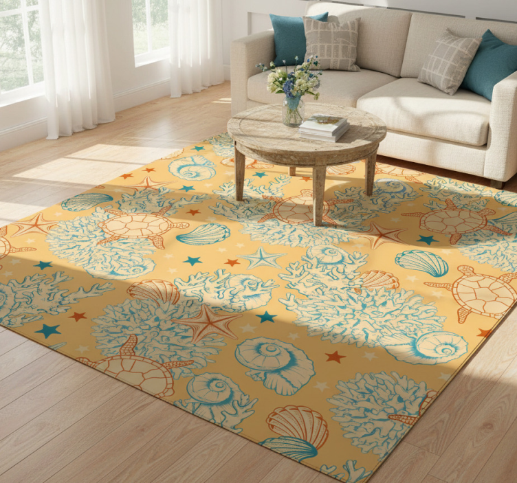 생동감 넘치는 디자인은 거북이, 불가사리, 다양한 조개를 포함한 정교하게 그려진 해양 생물을 특징으로 합니다. 배경은 따뜻한 노란색이며, 해양 요소의 세부 윤곽은 터쿼이즈와 오렌지색으로 강조됩니다. 산호 형성은 활기찬 패턴에 질감을 더하여 시각적으로 역동적인 구성을 만듭니다.