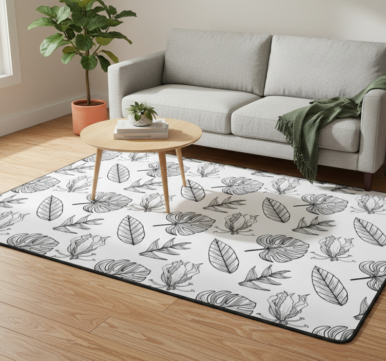 디자인은 흰 배경에 검은 선으로 그려진 다양한 잎과 꽃의 복잡한 패턴을 특징으로 합니다. 잎은 섬세한 디테일을 보여주며, 꽃 요소는 잎사귀를 보완합니다. 배열은 일관되며, 전체 표면에서 조화롭고 균형 잡힌 시각적 매력을 생성합니다. 비닐 카펫 꽃과 식물 잎이 있는 식물 패턴은 자연의 아름다움을 실내로 가져오는 매력적인 디자인으로, 다양한 공간에 생기를 불어넣습니다. 이 디자인은 화사한 꽃과 푸르른 식물 잎들이 어우러져 있어, 모던한 인테리어와도 잘 어울리며 고급스러운 분위기를 연출합니다.
