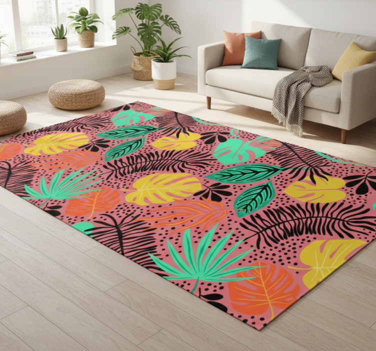 디자인은 다양한 녹색, 노란색, 오렌지색의 열대 잎들이 생동감 있게 배열되어 있으며, 활기찬 분홍색 배경과 대조를 이루고 있습니다. 섬세한 선과 점무늬를 포함한 검은색 악센트가 깊이를 제공하며, 전체적인 구성은 역동적이고 신선한 미학을 자아냅니다. 비닐 카펫 꽃과 식물 생동감 있는 잎사귀 구성입니다는 자연의 아름다움을 집 안으로 불러오는 매력적인 디자인입니다. 이 제품은 화사한 꽃과 생동감 넘치는 식물의 잎사귀가 조화를 이루어, 어떤 공간에서도 생기를 더합니다. 비닐 소재로 제작되어 내구성이 뛰어나고, 청소가 용이하여 실용성과 미적 요소를 동시에 만족시킵니다. 당신의 인테리어를 한층 업그레이드할 수 있는 완벽한 선택입니다!