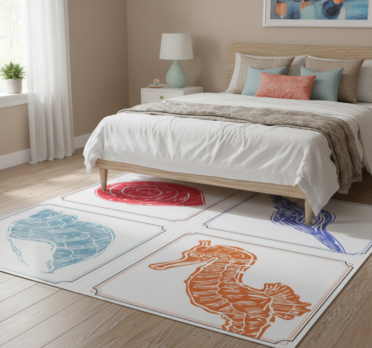 디자인은 그리드 형태로 배치된 네 가지 뚜렷하게 묘사된 해양 생물을 특징으로 합니다. 왼쪽 상단에는 빨간 나선형 조개껍데기가, 오른쪽 상단에는 파란 콘크 조개껍데기가 있습니다. 왼쪽 하단에는 연한 파란 조개껍데기가, 오른쪽 하단에는 주황색 해마가 있으며, 모두 장식적인 테두리에 둘러싸여 있습니다. 비닐 카펫 꽃과 식물 해양 생물 모티프는 자연의 아름다움을 집안으로 가져오는 매력적인 디자인으로, 여러분의 공간을 한층 더 생동감 있게 만들어 줍니다. 이 카펫은 화려한 꽃과 식물, 그리고 해양 생물 모티프가 조화롭게 어우러져 있어, 어디에 놓아도 눈길을 사로잡는 인테리어 소품이 될 것입니다. 뛰어난 디자인과 실용성을 동시에 갖춘 이 제품은 여러분의 집에 자연의 아름다움을 더해줍니다.