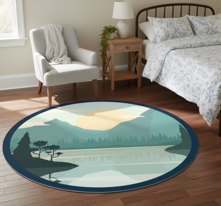 디자인은 주변의 산과 나무를 반영하는 잔잔한 물이 있는 평화로운 풍경을 특징으로 합니다. 큰 태양이 연한 파란 하늘에 걸쳐 있으며, 부드러운 구름이 함께 있습니다. 색상 팔레트는 다양한 녹색, 파란색, 부드러운 노란색의 음영으로 구성되어 있어 고요한 분위기를 만들어냅니다.