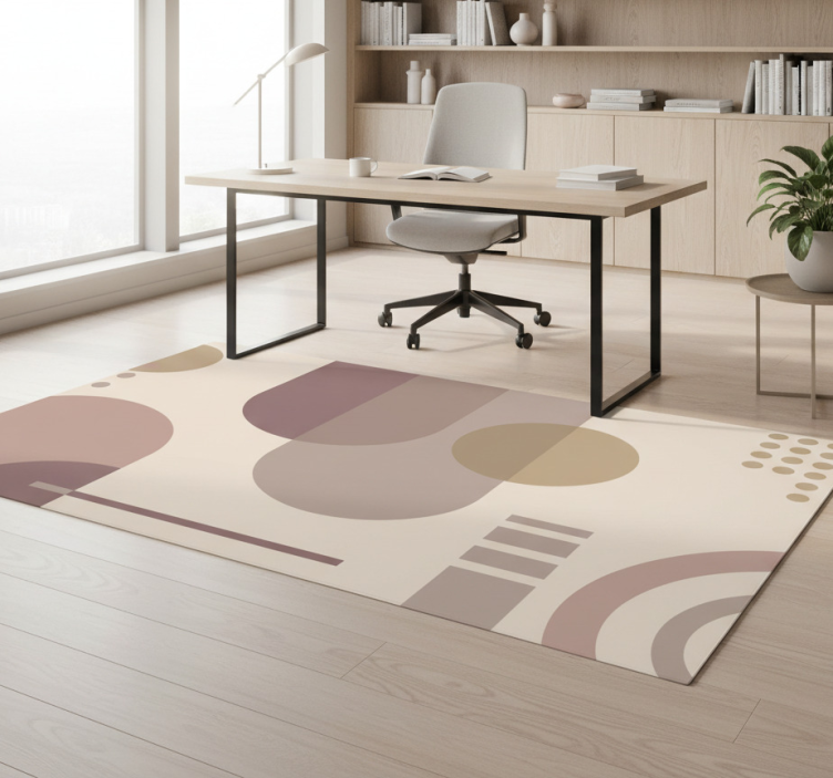 디자인은 큰 원, 반원, 선형 요소 등 다양한 기하학적 형태를 포함하고 있으며, 모두 조화롭게 배치되어 있습니다. 부드러운 분홍색, 갈색, 베이지색과 같은 차분한 색조의 팔레트가 편안한 효과를 주며, 다양한 불투명도가 전체 구성에 깊이와 질감을 더합니다. 기하학적 효과 비닐 카펫 갈색 기하학적 현대 미술