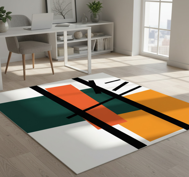 이 이미지는 기하학적 형태와 생동감 있는 색상이 결합된 현대적인 디자인을 특징으로 합니다. 강렬한 검은 선 사이에 오렌지, 초록, 노란색의 조합이 섞여 있어 시선을 사로잡는 구성을 만들어냅니다. 형태의 배열은 비대칭적이며, 역동적이고 현대적인 미학을 제공합니다. 기하학적 효과 비닐 카펫 추상 색상 구역