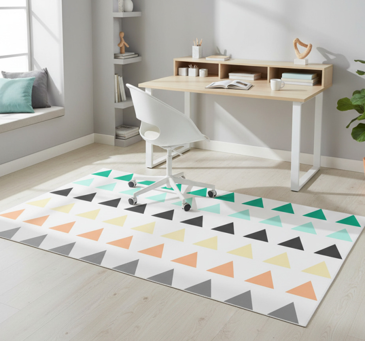 디자인은 다양한 색상의 삼각형이 수평으로 배열된 반복 패턴을 특징으로 합니다. 색상 팔레트에는 청록색, 민트색, 검정색, 노란색, 주황색, 회색의 음영이 포함되어 있습니다. 각 삼각형은 뾰족한 부분이 위를 향하도록 배치되어 있으며, 이는 표면을 가로질러 시각적으로 확장되는 기하학적 리듬을 만들어냅니다. 기하학적 효과 비닐 카펫 아기용 작은 삼각형 30개 세트