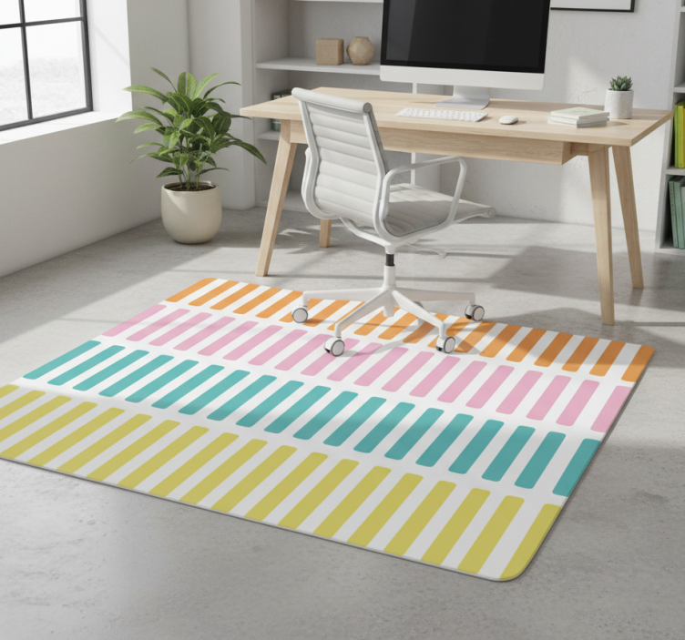 디자인은 주황색, 분홍색, 터쿼이즈색, 노란색의 교차하는 색상 줄무늬로 구성되어 있습니다. 각 줄무늬는 균일하게 배치되어 리드미컬한 패턴을 형성하며 표면을 가로지릅니다. 대담한 색상은 흰색 배경과 대조를 이루어 전체 디자인의 생동감 있고 유쾌한 특성을 더욱 강조합니다. 기하학적 효과 비닐 카펫 색깔 점토 스티커
