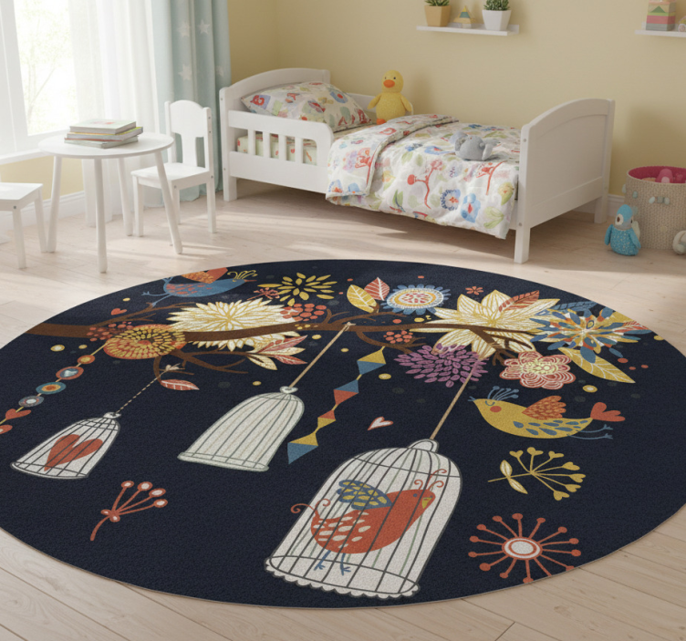 다채로운 꽃, 기발한 새들, 장식적인 새장으로 가득 찬 원형 디자인. 색상 팔레트는 어두운 배경에 강렬한 빨강, 노랑, 파랑, 초록이 어우러져 있습니다. 매달린 꽃 가지와 기하학적 패턴 같은 요소들이 생동감 넘치고 눈길을 끄는 디스플레이를 만들어내며, 디자인에 기분 좋은 터치를 더합니다. 어린 이용 비닐 카펫 새 정원 장식 비닐
