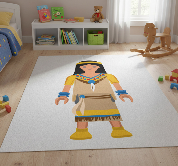 디자인은 전통 의상을 입은 캐릭터를 특징으로 하며, 다채로운 패턴이 장식된 노란색 상의와 프린지 스커트를 착용하고 있습니다. 팔에는 파란색 액세서리가 있으며, 캐릭터는 스타일리시한 검은색 헤어스타일을 가지고 있습니다. 머리에 깃털이 장식되어 있어 생동감 있고 유쾌한 표현을 더하고 있습니다. 어린 이용 비닐 카펫 플레이모빌 인디아