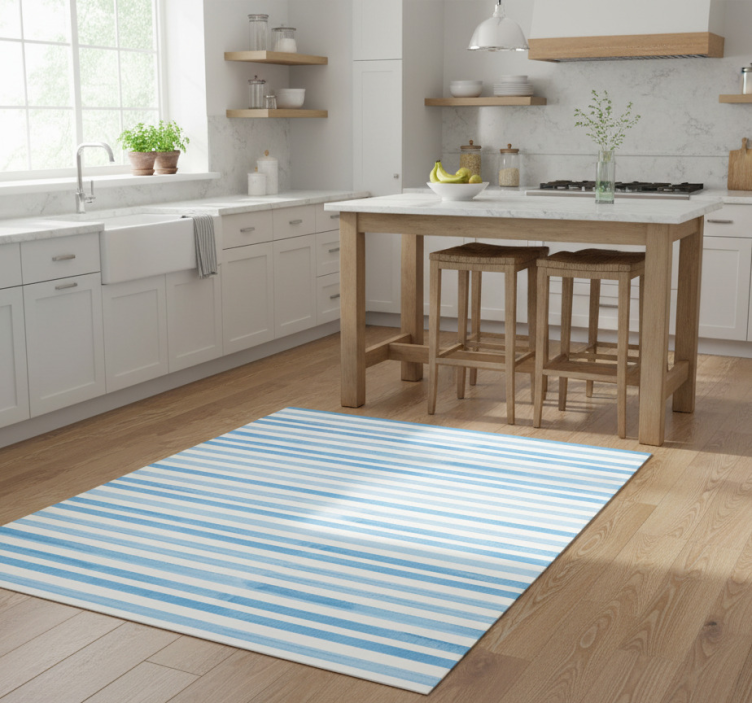 이미지는 흰색 배경에 다양한 파란색 음영의 수평 줄무늬가 특징입니다. 줄무늬는 수채화 효과를 보여주며, 일부는 더 밝고 반투명하게 나타나 부드럽고 흐르는 리듬을 만들어냅니다. 디자인은 반복적이며 시각적으로 매력적입니다. 비닐 주방 카펫 파란색 질감 체크 디자인
