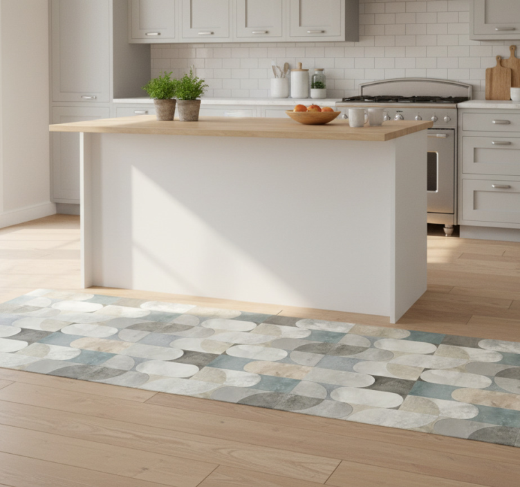회색, 연한 파란색, 그리고 베이지색의 다양한 음영으로 이루어진 원형과 길쭉한 형태들이 조화로운 기하학적 패턴을 형성합니다. 이 디자인은 매끄러운 요소와 질감 있는 요소가 혼합되어 있으며, 각 형태가 유동적인 배열로 연결되어 현대적인 미학을 만들어내어 리듬과 균형의 감각을 불러일으킵니다. 비닐 주방 카펫 현대 필 모자이크