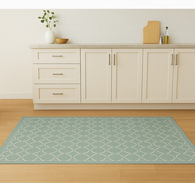 부드러운 청록색 배경에 체계적으로 배열된 겹치는 원형 모양의 기하학적 패턴. 디자인은 원형 모티프를 강조하는 대조적인 흰색 윤곽선을 활용하여 시각적으로 매력적이고 대칭적인 레이아웃을 만듭니다. 테두리는 전체 미학을 보완하며 복잡한 패턴을 프레임으로 감싸고 있습니다. 비닐 주방 카펫 부드러운 청록색 격자 무늬
