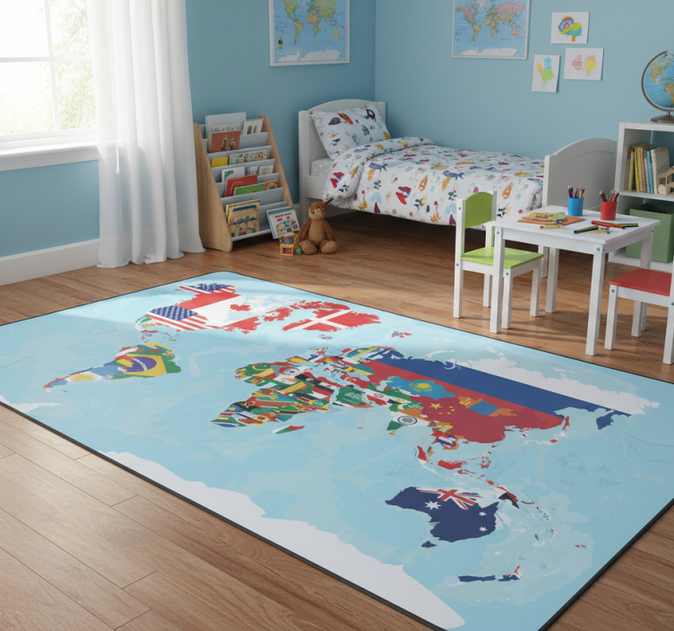 디자인은 다양한 지역을 대표하는 여러 나라의 국기가 정교하게 자세히 그려진 다채로운 세계 지도를 특징으로 합니다. 각 대륙은 독특하게 강조되어 있으며, 푸른 배경에 생동감 있는 국가 기호가 돋보입니다. 전체적인 효과는 시각적으로 매력적이며, 지리와 국제 문화에 대한 관심을 불러일으키는 것을 목표로 하고 있습니다. 세계 지도 비닐 카펫 세계지도 깃발 디자인
