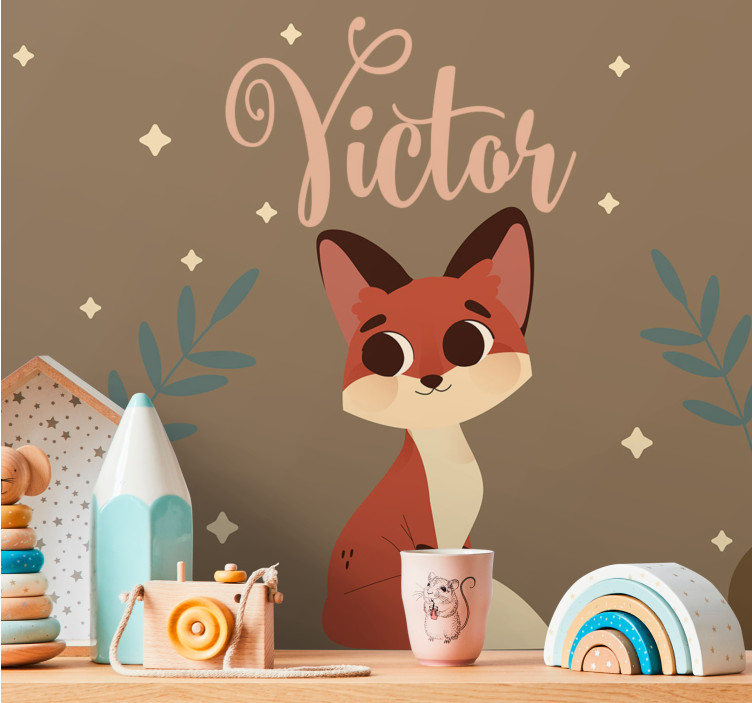 참조:: F9831매력적인 여우 캐릭터가 커다란 눈과 장난기 가득한 태도로 섬세한 잎사귀와 별들로 둘러싸여 있습니다. 디자인에는 'Victor'라는 이름이 포함되어 있어, 어린이 공간이나 장난스러운 공간에 잘 어울리는 개인적인 느낌을 더해줍니다.