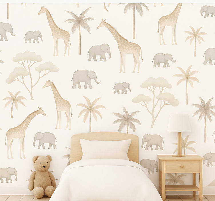 우아한 기린과 사랑스러운 코끼리가 스타일화된 야자수 사이에서 어우러진 이 디자인은 사파리 모험의 본질을 포착합니다. 부드러운 색상 팔레트는 고요한 분위기를 강조하며, 자연과의 연결과 평온함을 초대합니다. 야생 동물의 아름다움을 느낄 수 있는 공간에 완벽합니다. 아이의 침실 벽지 아이의 사바나