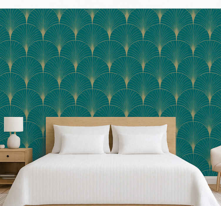 세련된 반복 디자인으로, 생동감 있는 청록색의 스타일화된 부채 모양이 금색 선으로 강조되어 있습니다. 이 복잡한 패턴은 자연의 우아함을 연상시키는 역동적인 시각적 흐름을 만들어냅니다. 이 매력적인 디자인은 미적 매력을 effortlessly 높이며, 어떤 환경에도 깊이와 매력을 더합니다.