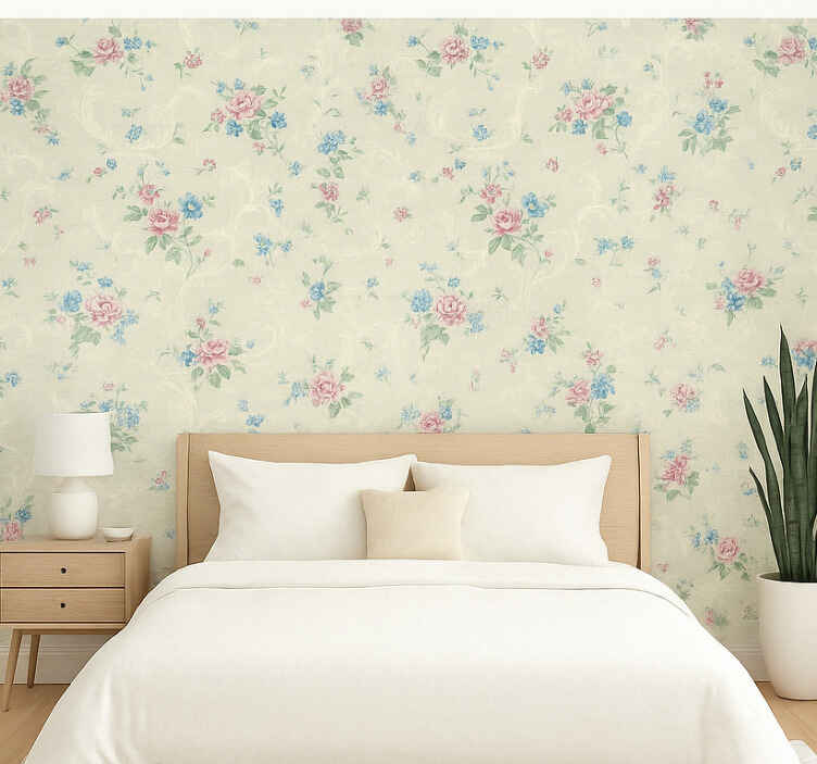 다채로운 꽃들, 특히 장미와 작은 꽃들이 어우러진 섬세한 디자인. 부드러운 분홍색과 파란색의 색조가 밝은 배경 위에서 조화롭게 어우러진다. 우아한 소용돌이 패턴이 섬세한 복잡성을 더하며, 전체적인 구성에서 평온함과 자연의 아름다움을 불러일으킨다. 마스터 침실 벽지 단순한 꽃 디자인